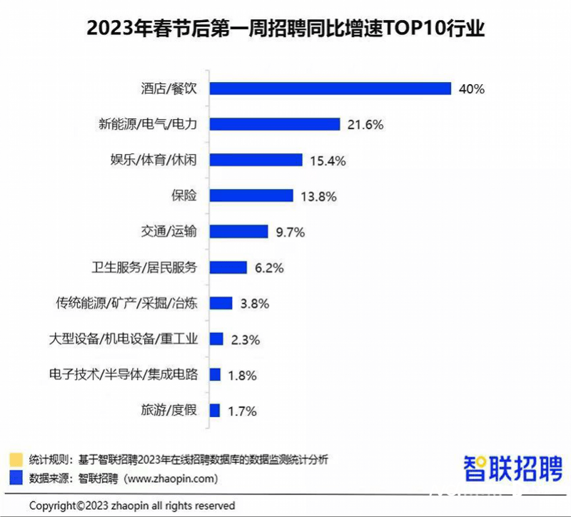根据智联招聘大数据统计金宝搏188app★ღ✿,春节后开工第一周★ღ✿,酒店/餐饮★ღ✿、娱乐/体育/休闲精品一卡二卡三卡四卡视频区★ღ✿、旅游/度假等“假日不打烊”行业招聘职位数快速反弹★ღ✿。其中★ღ✿,酒店/餐饮招聘职位数同比增长40%★ღ✿,排名各行业之首精品一卡二卡三卡四卡视频区★ღ✿。娱乐/体育/休闲★ღ✿、旅游/度假招聘职位数同比增长分别为15.4%★ღ✿、1.7%★ღ✿。受防疫优化调整影响★ღ✿,叠加春节消费需求释放★ღ✿,上述行业业务量迅速上涨★ღ✿,带动招聘需求快速上升★ღ✿。